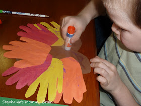 So when I saw the Hands and Feet Thanksgiving Turkey on EnchantedLearning.com* I knew we had to make it. Before you think I'm one of those Crafty Home School Moms, I'm not. We don't do crafts that often because I'm too type A and can't take the chaos. But I set aside my type A-ness today and embraced the chaos.